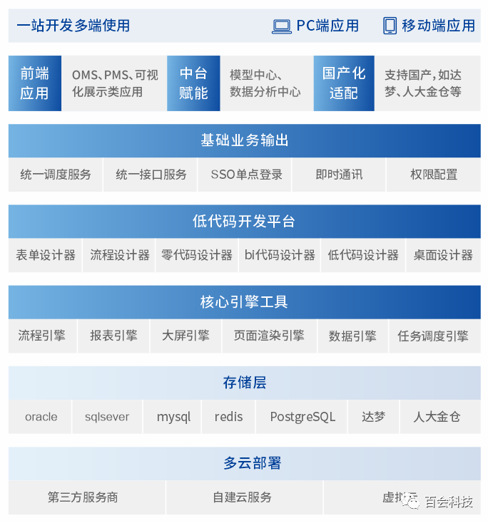 低代码开发平台作为电力IT软件的数字底座,是安全稳定、经济高效开发应用软件的基础,可以说开发平台的品质直接决定应用软件的品质。百会的低代码开发平台经过十余载的迭代积累,满足80%以上管理分析类软件的快速开发需要,目前已经开发了电网调度管理、电网设备运检管理、电网操作、值班日志、指标管理、自动成图、预测及辅助决策等类型应用产品,并在上百个客户现场提供后续软件的升级运维。