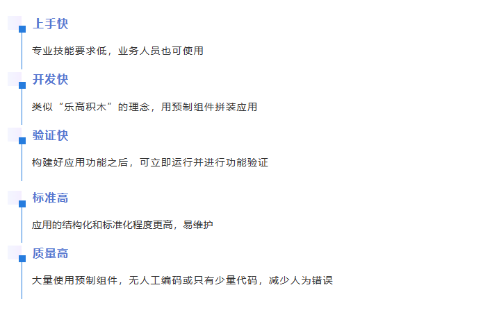 低代码开发平台带来的好处就是,三快两高:上手快、开发快、验证快,以及标准高、质量高。从而克服了传统软件工程效率低、IT人员依赖、难以适应业务端与技术端的变化等问题。